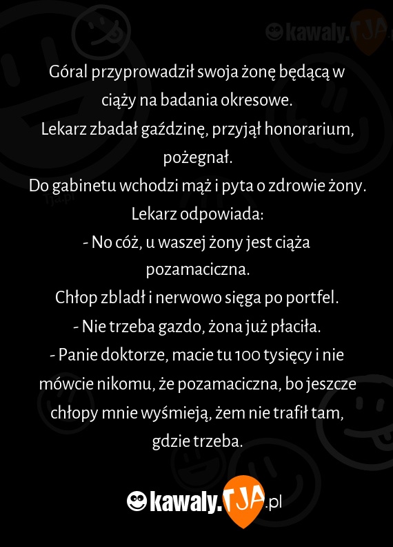 - Panie doktorze, macie tu 100 tysięcy i nie mówcie nikomu, że pozamaciczna, bo jeszcze chłopy mnie wyśmieją, żem nie trafił tam, gdzie trzeba.