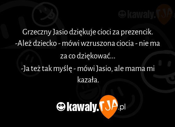 Grzeczny Jasio dziękuje cioci za prezencik. -Ależ dziecko - mówi wzruszona ciocia - nie ma za co dziękować... -Ja też tak myślę - mówi Jasio, ale mama mi kazała.