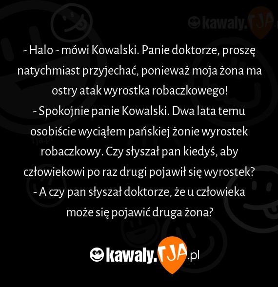- Spokojnie panie Kowalski. Dwa lata temu osobiście wyciąłem pańskiej żonie wyrostek robaczkowy. Czy słyszał pan kiedyś, aby człowiekowi po raz drugi pojawił się wyrostek?