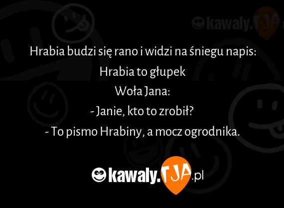 Hrabia budzi sie rano i widzi na sniegu napis: Hrabia to glupek Wola Jana: - Janie, kto to zrobil? - To pismo Hrabiny, a mocz ogrodnika.