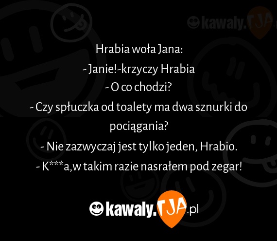 Hrabia wola Jana: - Janie!-krzyczy Hrabia - O co chodzi? - Czy spluczka od toalety ma dwa sznurki do pociagania? - Nie zazwyczaj jest tylko jeden, Hrabio. - K***a,w takim razie nasralem pod zegar!
