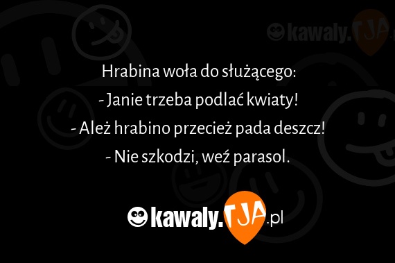 Hrabina woła do służącego: - Janie trzeba podlać kwiaty! - Ależ hrabino przecież pada deszcz! - Nie szkodzi, weź parasol.