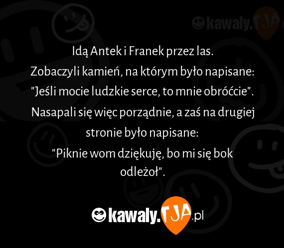 Idą Antek i Franek przez las. Zobaczyli kamień, na którym było napisane: "Jeśli mocie ludzkie serce, to mnie obróćcie". Nasapali się więc porządnie, a zaś na drugiej stronie było napisane: "Piknie wom dziękuję, bo mi się bok odleżoł".