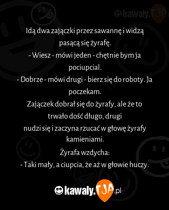 Idą dwa zajączki przez sawannę i widzą pasącą się żyrafę.