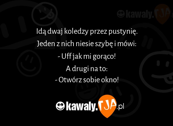 Idą dwaj koledzy przez pustynię. Jeden z nich niesie szybę i mówi: - Uff jak mi gorąco! A drugi na to: - Otwórz sobie okno!