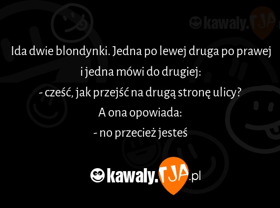Ida dwie blondynki. Jedna po lewej druga po prawej i jedna mówi do drugiej: - cześć, jak przejść na drugą stronę ulicy? A ona opowiada: - no przecież jesteś