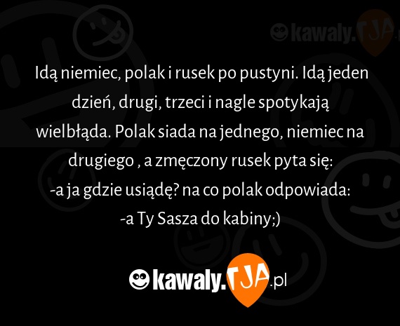 Idą niemiec, polak i rusek po pustyni. Idą jeden dzień, drugi, trzeci i nagle spotykają wielbłąda. Polak siada na jednego, niemiec na drugiego , a zmęczony rusek pyta się: -a ja gdzie usiądę? na co polak odpowiada: -a Ty Sasza do kabiny;)