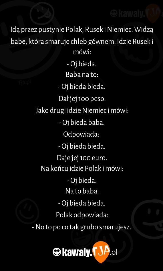 Idą przez pustynie Polak, Rusek i Niemiec. Widzą babę, która smaruje chleb gównem. Idzie Rusek i mówi: