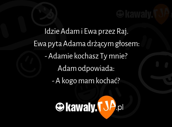 Idzie Adam i Ewa przez Raj. Ewa pyta Adama drzacym glosem: - Adamie kochasz Ty mnie? Adam odpowiada: - A kogo mam kochac?