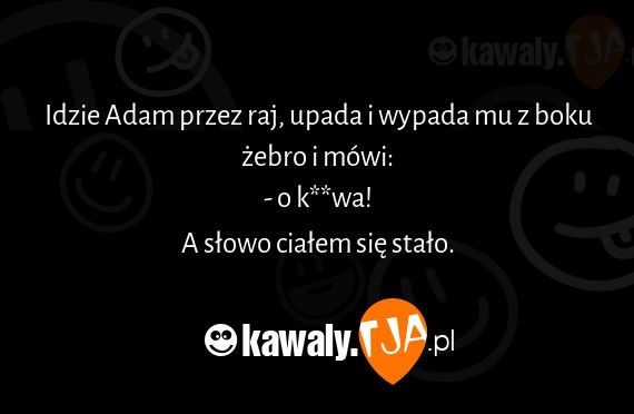 Idzie Adam przez raj, upada i wypada mu z boku żebro i mówi: - o k**wa! A słowo ciałem się stało.