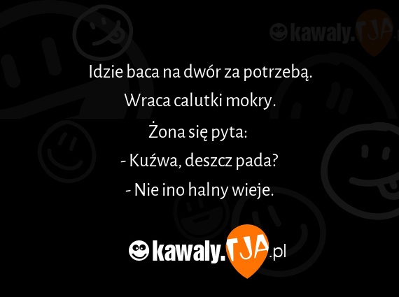 Idzie baca na dwór za potrzebą. Wraca calutki mokry. Żona się pyta: - Kuźwa, deszcz pada? - Nie ino halny wieje.