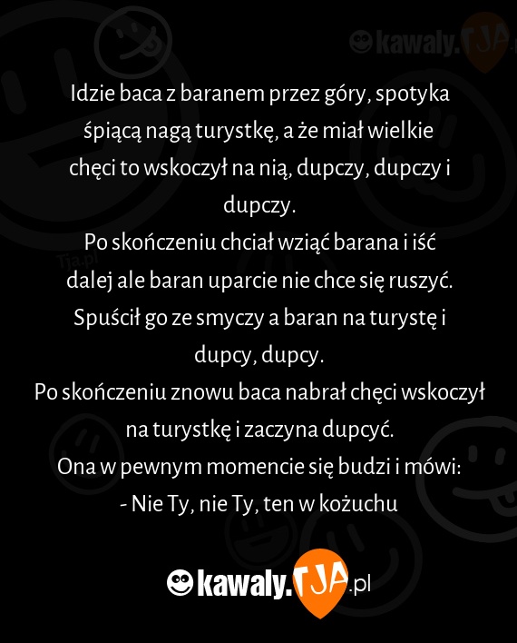 Idzie baca z baranem przez góry, spotyka śpiącą nagą turystkę, a że miał wielkie chęci to wskoczył na nią, dupczy, dupczy i dupczy.
