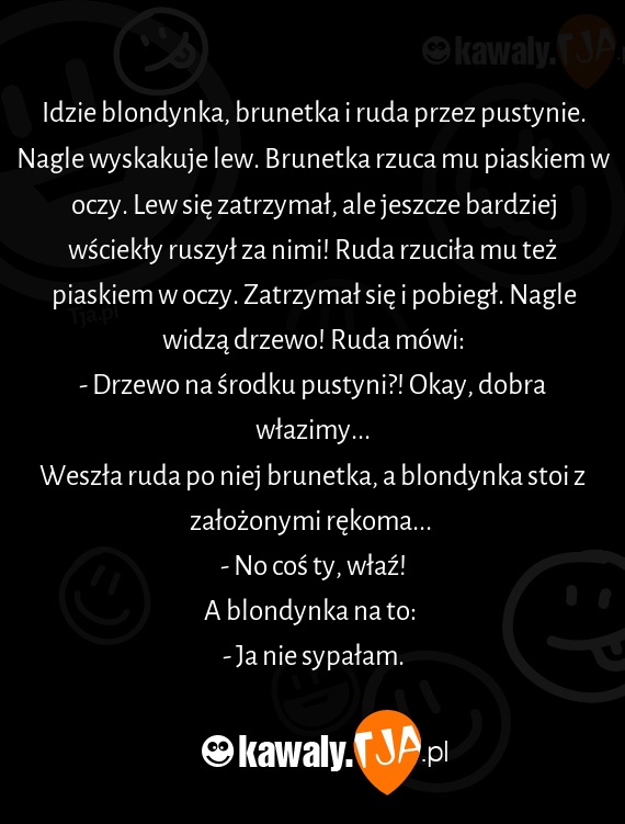 Idzie blondynka, brunetka i ruda przez pustynie. Nagle wyskakuje lew. Brunetka rzuca mu piaskiem w oczy. Lew się zatrzymał, ale jeszcze bardziej wściekły ruszył za nimi! Ruda rzuciła mu też piaskiem w oczy. Zatrzymał się i pobiegł. Nagle widzą drzewo! Ruda mówi: