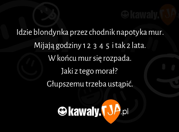 Idzie blondynka przez chodnik napotyka mur. Mijają godziny 1 2 3 4 5 i tak 2 lata. W końcu mur się rozpada. Jaki z tego morał? Głupszemu trzeba ustąpić.