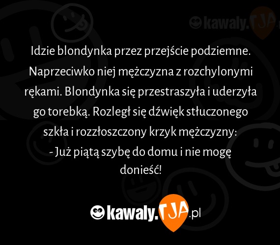 Idzie blondynka przez przejście podziemne. Naprzeciwko niej mężczyzna z rozchylonymi rękami. Blondynka się przestraszyła i uderzyła go torebką. Rozległ się dźwięk stłuczonego szkła i rozzłoszczony krzyk mężczyzny: