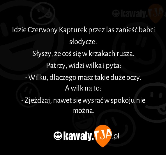 Idzie Czerwony Kapturek przez las zanieść babci słodycze. Słyszy, że coś się w krzakach rusza. Patrzy, widzi wilka i pyta: - Wilku, dlaczego masz takie duże oczy. A wilk na to: - Zjeżdżaj, nawet się wysrać w spokoju nie można.
