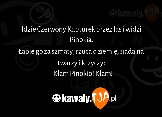 Idzie Czerwony Kapturek przez las i widzi Pinokia. Lapie go za szmaty, rzuca o ziemie, siada na twarzy i krzyczy: - Klam Pinokio! Klam!