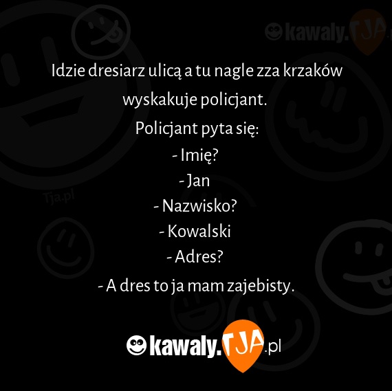 Idzie dresiarz ulicą a tu nagle zza krzaków wyskakuje policjant. Policjant pyta się: - Imię? - Jan - Nazwisko? - Kowalski - Adres? - A dres to ja mam zajebisty.