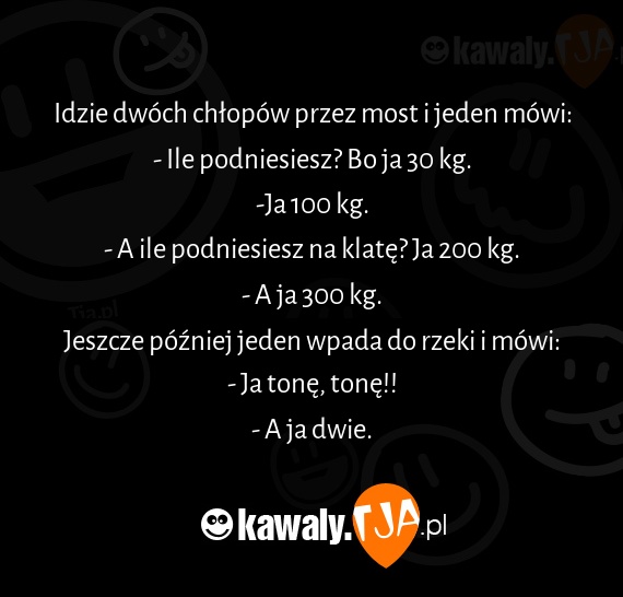 Idzie dwóch chłopów przez most i jeden mówi: - Ile podniesiesz? Bo ja 30 kg. -Ja 100 kg. - A ile podniesiesz na klatę? Ja 200 kg. - A ja 300 kg. Jeszcze później jeden wpada do rzeki i mówi: - Ja tonę, tonę!! - A ja dwie.