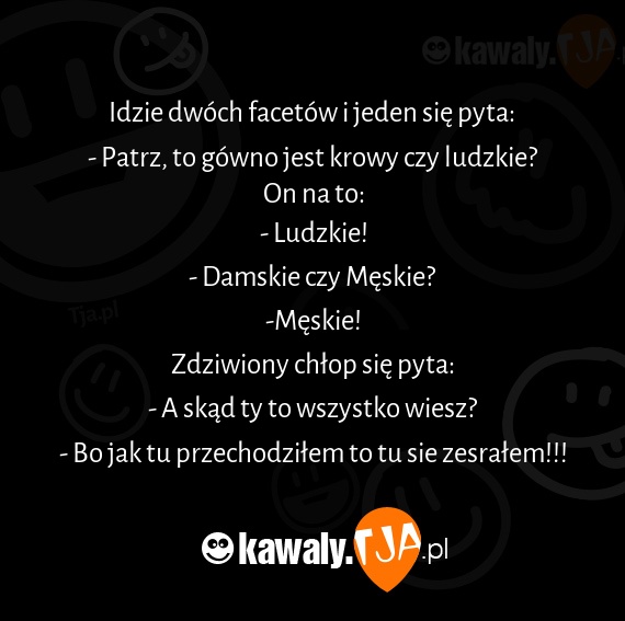 Idzie dwóch facetów i jeden się pyta: - Patrz, to gówno jest krowy czy ludzkie? On na to: - Ludzkie! - Damskie czy Męskie? -Męskie! Zdziwiony chłop się pyta: - A skąd ty to wszystko wiesz? - Bo jak tu przechodziłem to tu sie zesrałem!!!