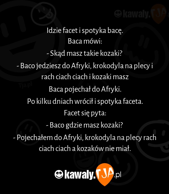 - Baco jedziesz do Afryki, krokodyla na plecy i rach ciach ciach i kozaki masz