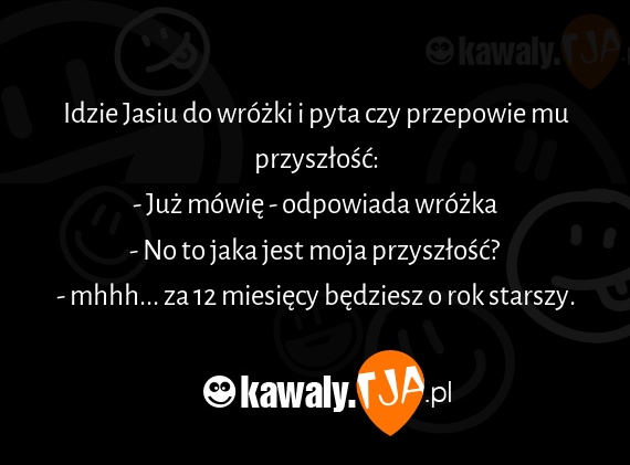 Idzie Jasiu do wrozki i pyta czy przepowie mu przyszlosc: - Juz mowie - odpowiada wrozka - No to jaka jest moja przyszlosc? - mhhh... za 12 miesiecy bedziesz o rok starszy.