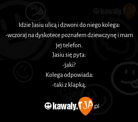 Idzie Jasiu ulica i dzwoni do niego kolega: -wczoraj na dyskotece poznalem dziewczyne i mam jej telefon. Jasiu sie pyta: -jaki? Kolega odpowiada: -taki z klapka.