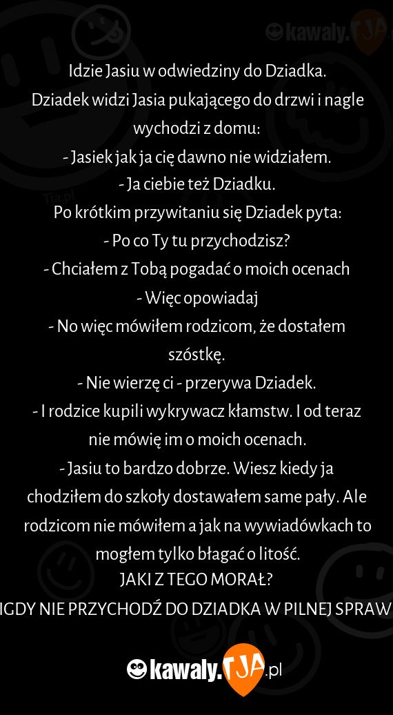 - Jasiu to bardzo dobrze. Wiesz kiedy ja chodziłem do szkoły dostawałem same pały. Ale rodzicom nie mówiłem a jak na wywiadówkach to mogłem tylko błagać o litość.