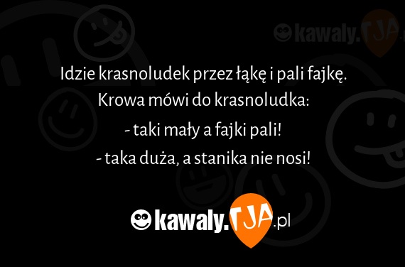 Idzie krasnoludek przez łąkę i pali fajkę. Krowa mówi do krasnoludka: - taki mały a fajki pali! - taka duża, a stanika nie nosi!