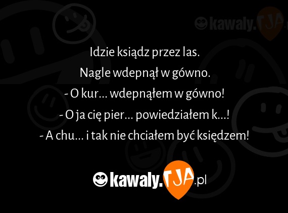 Idzie ksiądz przez las. Nagle wdepnął w gówno. - O kur... wdepnąłem w gówno! - O ja cię pier... powiedziałem k...! - A chu... i tak nie chciałem być księdzem!