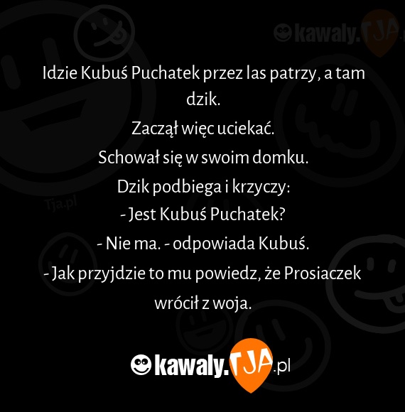 Idzie Kubus Puchatek przez las patrzy, a tam dzik. Zaczal wiec uciekac. Schowal sie w swoim domku. Dzik podbiega i krzyczy: - Jest Kubus Puchatek? - Nie ma. - odpowiada Kubus. - Jak przyjdzie to mu powiedz, ze Prosiaczek wrocil z woja.