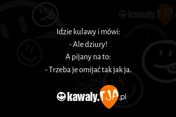 Idzie kulawy i mówi: - Ale dziury! A pijany na to: - Trzeba je omijać tak jak ja.
