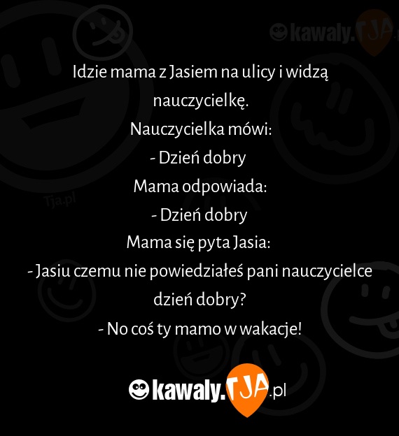 Idzie mama z Jasiem na ulicy i widzą nauczycielkę. Nauczycielka mówi: - Dzień dobry Mama odpowiada: - Dzień dobry Mama się pyta Jasia: - Jasiu czemu nie powiedziałeś pani nauczycielce dzień dobry? - No coś ty mamo w wakacje!
