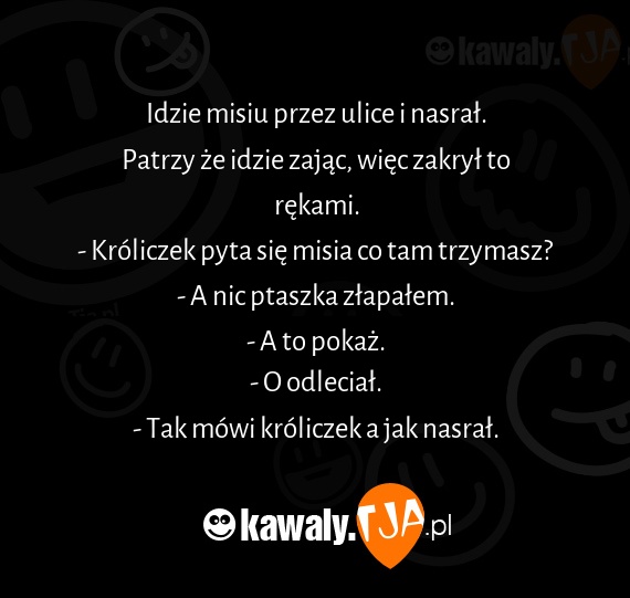 Idzie misiu przez ulice i nasrał. Patrzy że idzie zając, więc zakrył to rękami. - Króliczek pyta się misia co tam trzymasz? - A nic ptaszka złapałem. - A to pokaż. - O odleciał. - Tak mówi króliczek a jak nasrał.