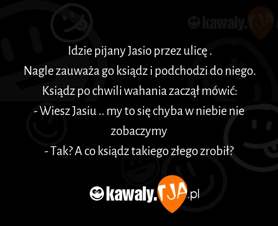 Idzie pijany Jasio przez ulicę . Nagle zauważa go ksiądz i podchodzi do niego. Ksiądz po chwili wahania zaczął mówić: - Wiesz Jasiu .. my to się chyba w niebie nie zobaczymy - Tak? A co ksiądz takiego złego zrobił?
