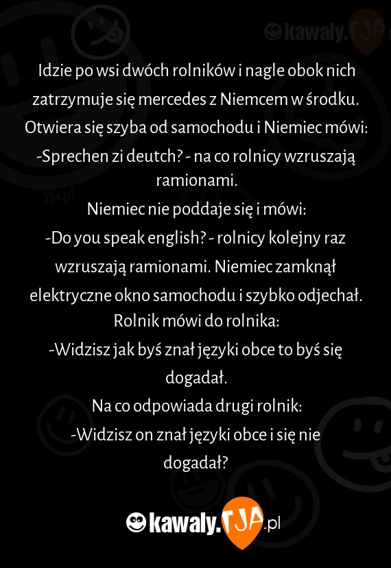 -Do you speak english? - rolnicy kolejny raz wzruszają ramionami. Niemiec zamknął elektryczne okno samochodu i szybko odjechał. Rolnik mówi do rolnika: