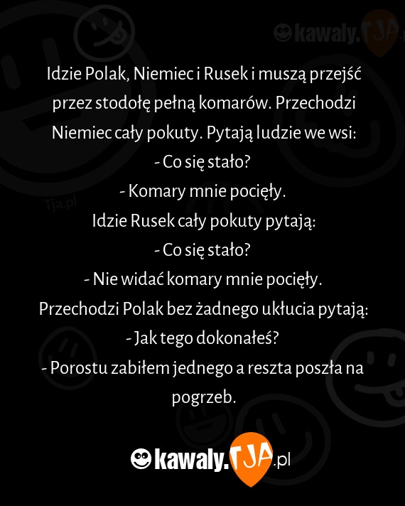 Idzie Polak, Niemiec i Rusek i muszą przejść przez stodołę pełną komarów. Przechodzi Niemiec cały pokuty. Pytają ludzie we wsi: