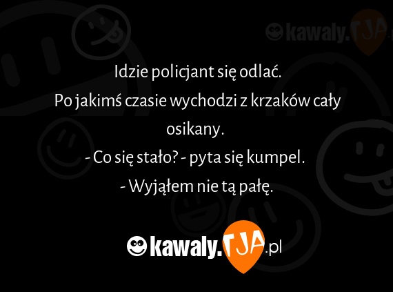 Idzie policjant sie odlac. Po jakims czasie wychodzi z krzakow caly osikany. - Co sie stalo? - pyta sie kumpel. - Wyjalem nie ta pale.