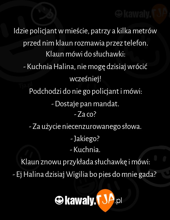 Idzie policjant w mieście, patrzy a kilka metrów przed nim klaun rozmawia przez telefon.
