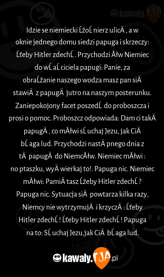 Idzie se niemiecki żołnierz ulicą, a w oknie jednego domu siedzi papuga i skrzeczy: Żeby Hitler zdechł. Przychodzi ów Niemiec do właściciela papugi: Panie, za obrażanie naszego wodza masz pan się stawić z papugą jutro na naszym posterunku. Zaniepokojony facet poszedł do proboszcza i prosi o pomoc. Proboszcz odpowiada: Dam ci taką papugę, co mówi słuchaj Jezu, jak Cię błaga lud. Przychodzi następnego dnia z tą papugą do Niemców. Niemiec mówi : no ptaszku, wyćwierkaj to!. Papuga nic. Niemiec mówi: Pamiętasz żeby Hitler zdechł? Papuga nic. Sytuacja się powtarza kilka razy, Niemcy nie wytrzymują i krzyczą: Żeby Hitler zdechł! Żeby Hitler zdechł! Papuga na to: Słuchaj Jezu,jak Cię błaga lud.