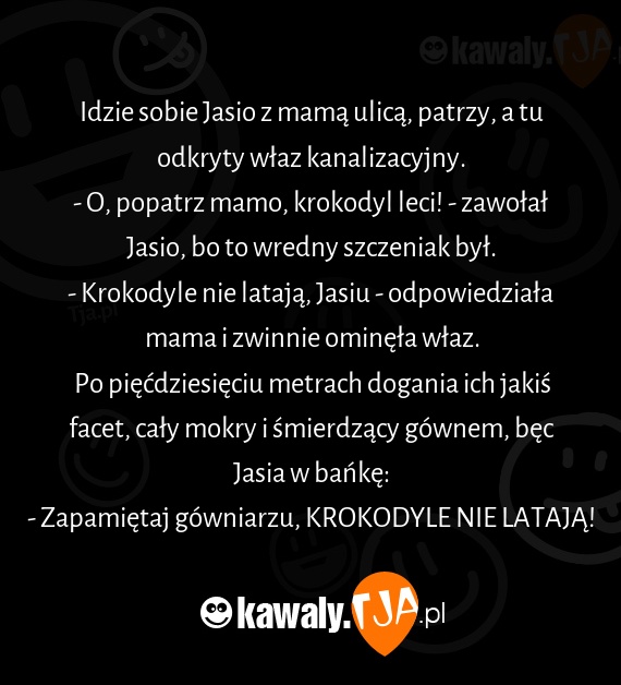 - Krokodyle nie latają, Jasiu - odpowiedziała mama i zwinnie ominęła właz.