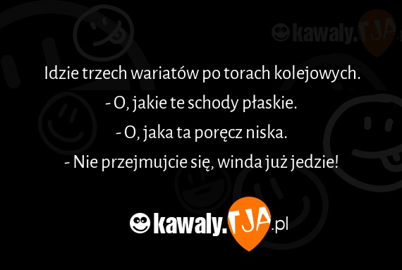 Idzie trzech wariatów po torach kolejowych. - O, jakie te schody płaskie. - O, jaka ta poręcz niska. - Nie przejmujcie się, winda już jedzie!