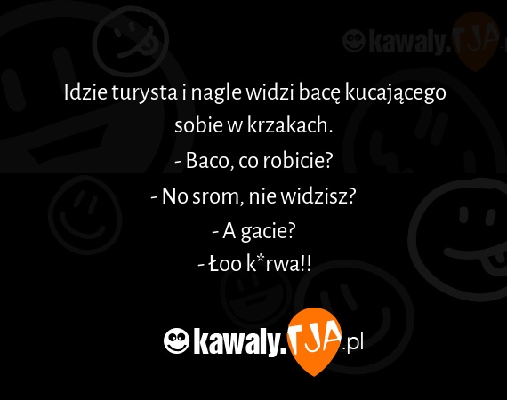 Idzie turysta i nagle widzi bacę kucającego sobie w krzakach. - Baco, co robicie? - No srom, nie widzisz? - A gacie? - Łoo k*rwa!!