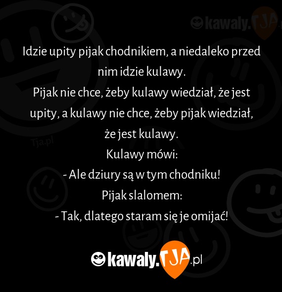 Idzie upity pijak chodnikiem, a niedaleko przed nim idzie kulawy.