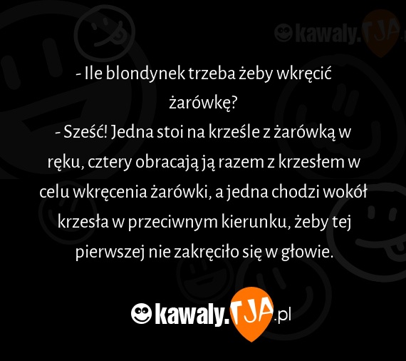 - Sześć! Jedna stoi na krześle z żarówką w ręku, cztery obracają ją razem z krzesłem w celu wkręcenia żarówki, a jedna chodzi wokół krzesła w przeciwnym kierunku, żeby tej pierwszej nie zakręciło się w głowie.