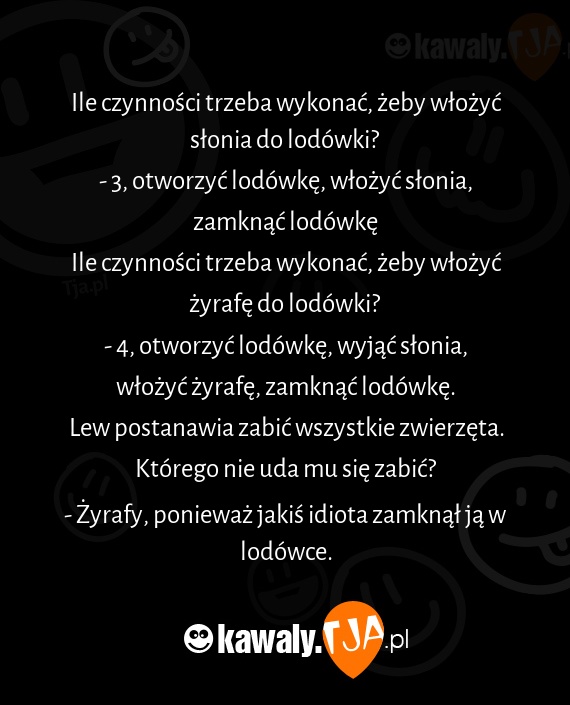 Ile czynności trzeba wykonać, żeby włożyć słonia do lodówki? - 3, otworzyć lodówkę, włożyć słonia, zamknąć lodówkę Ile czynności trzeba wykonać, żeby włożyć żyrafę do lodówki? - 4, otworzyć lodówkę, wyjąć słonia, włożyć żyrafę, zamknąć lodówkę. Lew postanawia zabić wszystkie zwierzęta. Którego nie uda mu się zabić? - Żyrafy, ponieważ jakiś idiota zamknął ją w lodówce.