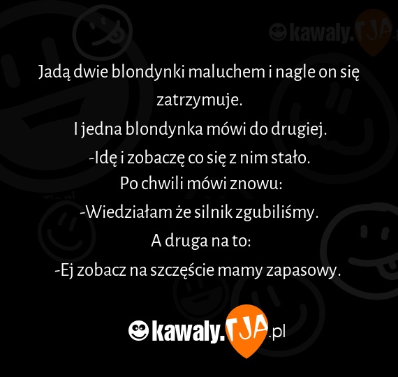 Jadą dwie blondynki maluchem i nagle on się zatrzymuje. I jedna blondynka mówi do drugiej. -Idę i zobaczę co się z nim stało. Po chwili mówi znowu: -Wiedziałam że silnik zgubiliśmy. A druga na to: -Ej zobacz na szczęście mamy zapasowy.