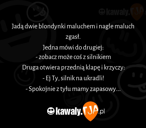 Jadą dwie blondynki maluchem i nagle maluch zgasł. Jedna mówi do drugiej: - zobacz może coś z silnikiem Druga otwiera przednią klapę i krzyczy: - Ej Ty, silnik na ukradli! - Spokojnie z tyłu mamy zapasowy...