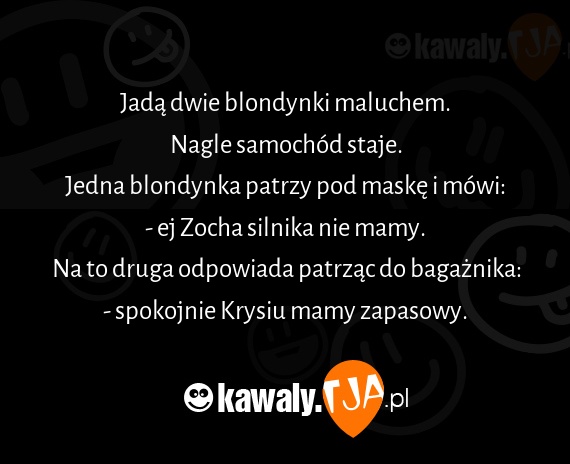 Jadą dwie blondynki maluchem. Nagle samochód staje. Jedna blondynka patrzy pod maskę i mówi: - ej Zocha silnika nie mamy. Na to druga odpowiada patrząc do bagażnika: - spokojnie Krysiu mamy zapasowy.