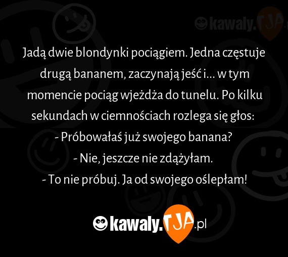 Jadą dwie blondynki pociągiem. Jedna częstuje drugą bananem, zaczynają jeść i... w tym momencie pociąg wjeżdża do tunelu. Po kilku sekundach w ciemnościach rozlega się głos: